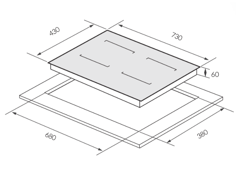Mặt kính 730 × 430 mm, khoét đá 680 × 380,5 mm, phù hợp không gian bếp hiện đại.