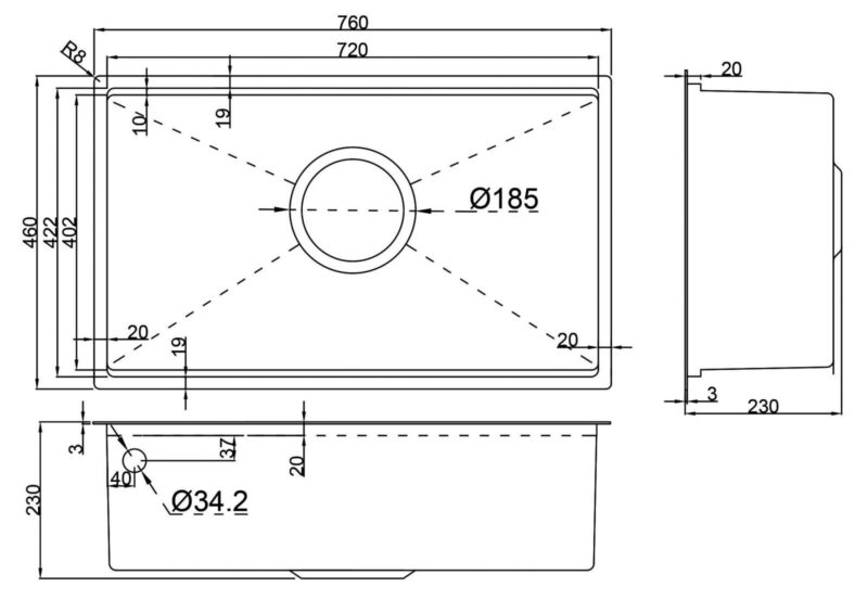 • Kích thước chậu: 760 x 480 x 230 (mm)