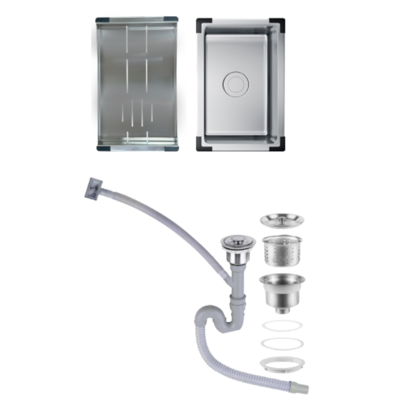 - Inox dày 1.0 + 3.0 mm giúp chậu cứng cáp, chống ồn, chống gỉ sét và dễ vệ sinh. Bên cạnh đó, bộ phụ kiện đi kèm như bộ xả, siphon, thau và hộp dao góp phần nâng cao trải nghiệm sử dụng, đồng thời tối ưu hóa không gian bếp.