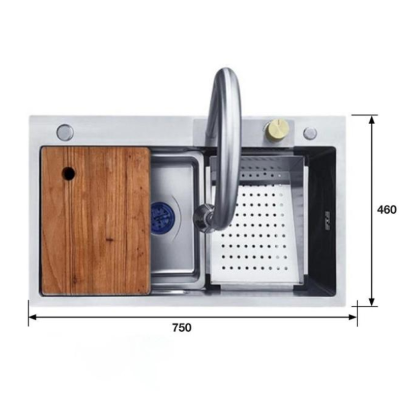 - Với độ dày 1.0 + 3.0 mm và bồn sâu 240 mm, sản phẩm mang đến sự chắc chắn, thoải mái khi rửa và hạn chế bắn nước hiệu quả. Kích thước 750 x 460 mm lý tưởng cho các căn bếp có diện tích vừa phải.