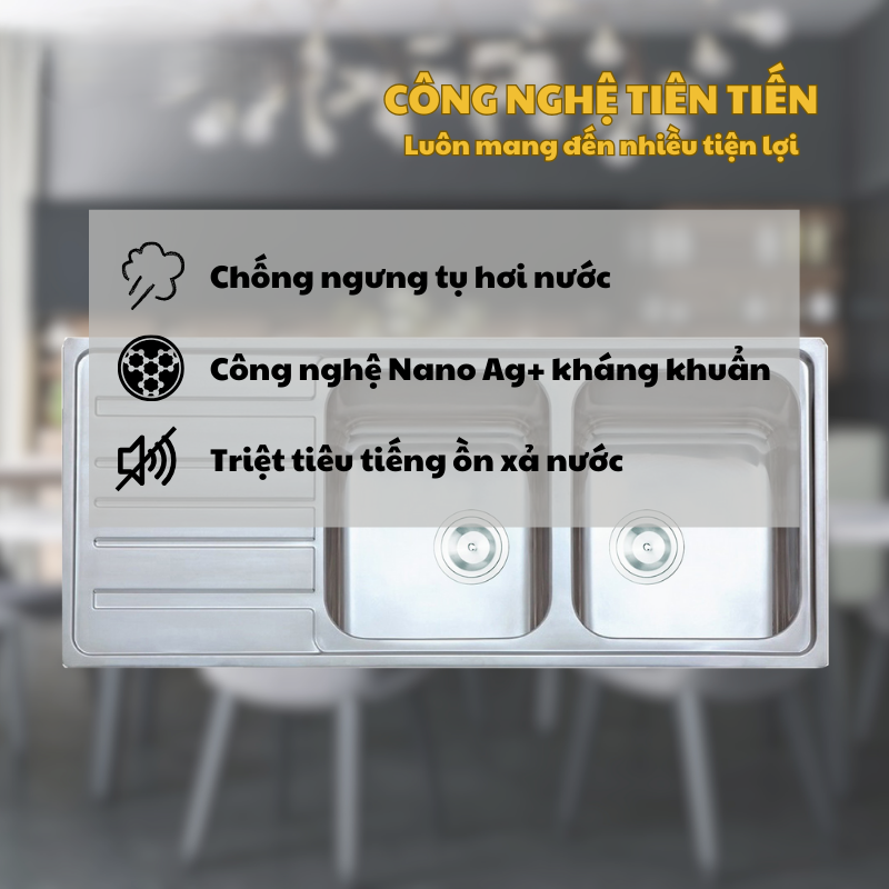 - Bên cạnh đó, tấm chống ồn mặt sau bằng cao su tổng hợp dày 3mm giúp giảm thiểu tiếng ồn phát sinh khi xả nước hoặc va chạm vật dụng, tạo cảm giác yên tĩnh và dễ chịu khi sử dụng. Sản phẩm hỗ trợ lắp đặt linh hoạt với cả hai phương án dương và bán âm mặt đá, giúp dễ dàng tích hợp trong nhiều phong cách thiết kế bếp khác nhau.