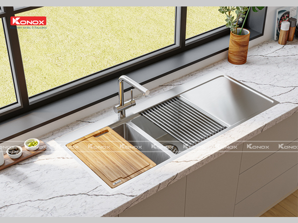 Konox KN11650TD Bàn Phải được thiết kế hạ bậc thông minh, cho phép sử dụng linh hoạt các phụ kiện như thớt gỗ và rollmat ngay trên miệng chậu. Điều này giúp tạo ra không gian sơ chế – rửa – để ráo khép kín, tiết kiệm diện tích mặt bàn bếp và nâng cao hiệu quả làm việc. - Chậu 2 hố rộng rãi kèm bàn chờ tiện lợi