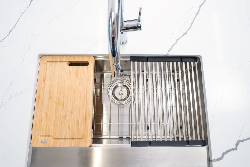 Konox KN8051AS Retta được thiết kế hạ bậc thông minh, cho phép tích hợp trọn bộ phụ kiện tiện ích gồm thớt gỗ, rollmat, colander và bottom grid. Sự kết hợp này giúp hình thành một khu vực sơ chế – rửa – để ráo khép kín, tiết kiệm diện tích mặt bàn và nâng cao hiệu quả làm việc trong gian bếp. - Hố chậu đơn rộng rãi – rửa thoải mái mọi loại dụng cụ