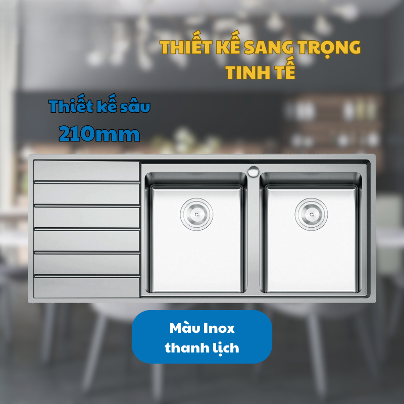Sở hữu 2 hố chậu bằng nhau, sản phẩm cho phép thực hiện đồng thời nhiều thao tác như rửa – tráng – sơ chế thực phẩm mà không bị giới hạn không gian, tối ưu hóa thời gian nấu nướng và vệ sinh. - Lòng chậu sâu – hạn chế bắn nước và tăng dung tích chứa