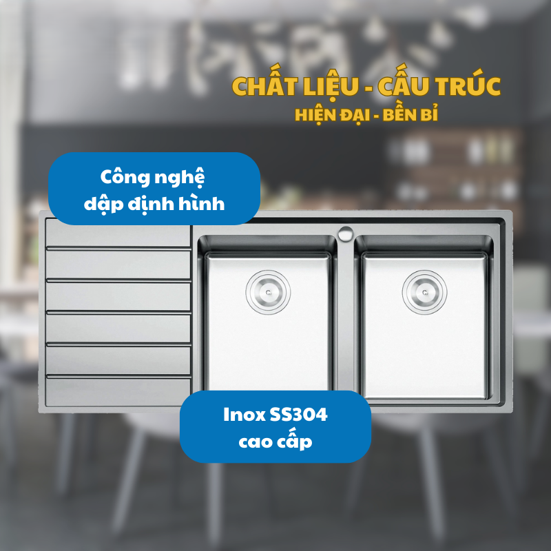 - Sử dụng inox 304 AISI tiêu chuẩn Hoa Kỳ cùng bề mặt hoàn thiện sáng bóng nhờ công nghệ Polishing, chậu không chỉ bền bỉ theo thời gian mà còn giữ được vẻ đẹp sang trọng, sạch sẽ và dễ vệ sinh. Công nghệ dập định hình hiện đại giúp sản phẩm đạt độ chính xác cao, các chi tiết đồng bộ, sắc nét và chắc chắn trong quá trình lắp đặt cũng như sử dụng.