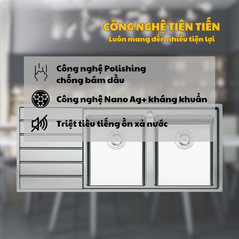 - Chậu rửa được trang bị hệ thống thoát nước Siphon cải tiến, bát rác 3 lớp kháng khuẩn phủ Nano Ag+, tích hợp tấm chống ồn mặt sau và lớp phủ chống ngưng tụ, mang đến sự êm ái và an toàn trong quá trình sử dụng hằng ngày. Đặc biệt, với thiết kế góc lượn R15mm, việc vệ sinh lòng chậu trở nên đơn giản hơn, hạn chế bám cặn và đảm bảo vệ sinh tối đa.