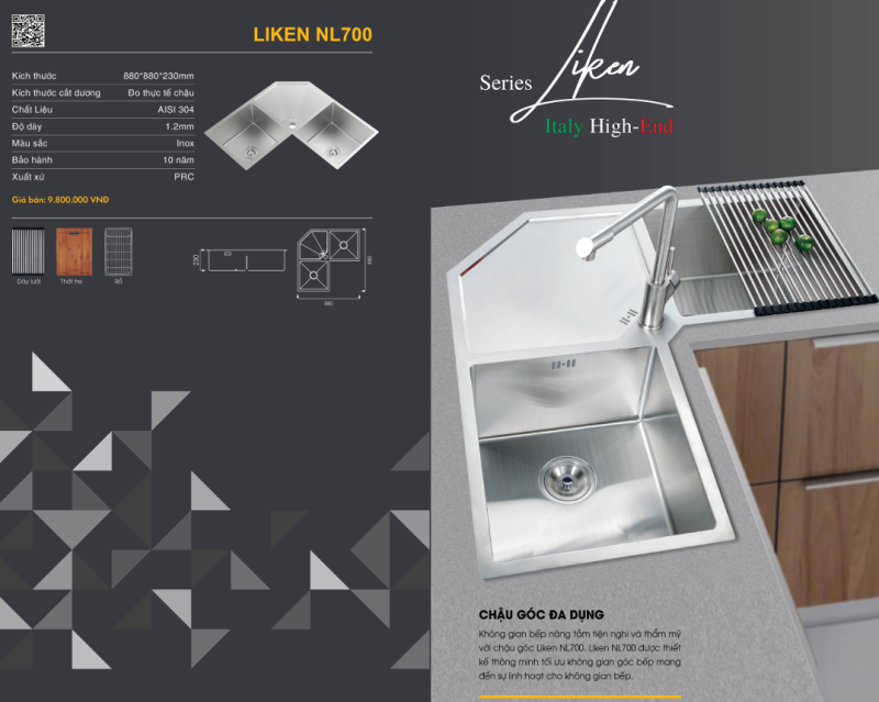 - Chậu rửa bát NoBiNox LIKEN NL700 gây ấn tượng với chất liệu inox 304 đạt chuẩn AISI 18/10, mang lại độ bền cao, chống oxy hóa và sáng bóng bền màu theo thời gian. Độ dày 1.2mm giúp tăng độ cứng cáp, hạn chế biến dạng trong quá trình sử dụng. Đây là sản phẩm thích hợp cho những ai mong muốn đầu tư lâu dài cho căn bếp của mình.