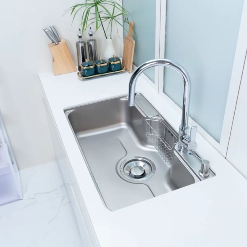 - Chậu sở hữu thiết kế 1 hố sâu rộng với góc bo tròn mềm mại, giúp việc rửa chén đĩa trở nên thuận tiện và giảm thiểu nước bắn ra ngoài. Tính năng chống ồn và chống ngưng tụ nước mặt sau chậu tạo sự thoải mái khi sử dụng, đồng thời giữ cho khu vực bếp luôn sạch sẽ và yên tĩnh. Ngoài ra, gờ hạ bậc linh hoạt hỗ trợ việc lắp đặt các phụ kiện đa dạng như rổ, khay, thớt rất tiện lợi.