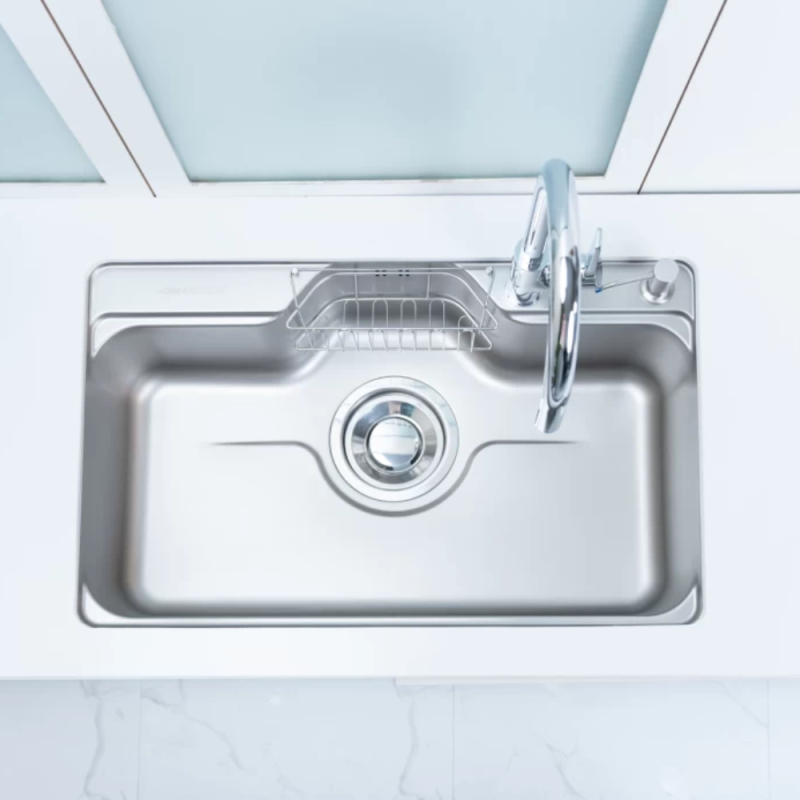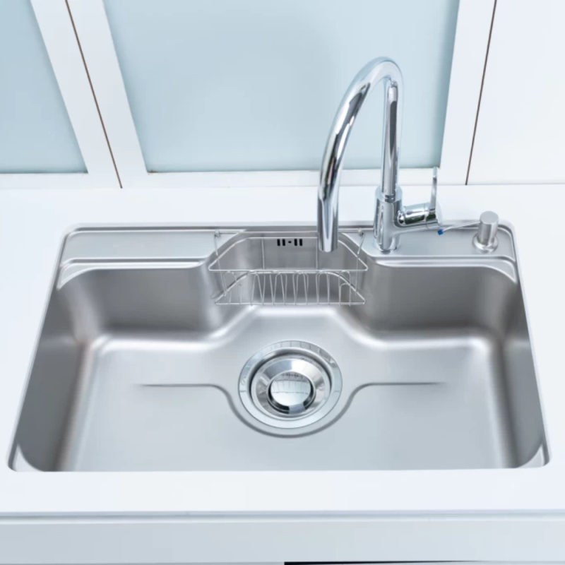 - Chậu sở hữu thiết kế 1 hố sâu rộng với góc bo tròn mềm mại, giúp việc rửa chén đĩa trở nên thuận tiện và giảm thiểu nước bắn ra ngoài. Tính năng chống ồn và chống ngưng tụ nước mặt sau chậu tạo sự thoải mái khi sử dụng, đồng thời giữ cho khu vực bếp luôn sạch sẽ và yên tĩnh. Ngoài ra, gờ hạ bậc linh hoạt hỗ trợ việc lắp đặt các phụ kiện đa dạng như rổ, khay, thớt rất tiện lợi.