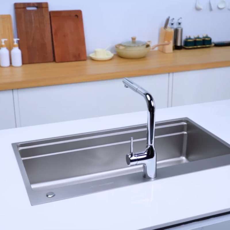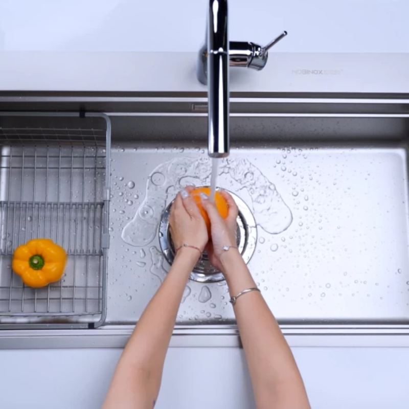 - Chậu còn được trang bị công nghệ giảm tiếng ồn với lớp cao su tổng hợp dày 3mm mặt sau, tạo cảm giác yên tĩnh khi sử dụng. Độ dày 1.2mm đảm bảo chậu không bị biến dạng, cong vênh dù phải sử dụng trong môi trường bếp liên tục. Với thiết kế gờ hạ bậc thông minh, chậu dễ dàng lắp đặt và tích hợp nhiều phụ kiện hỗ trợ, mang đến trải nghiệm sử dụng tiện lợi và linh hoạt.