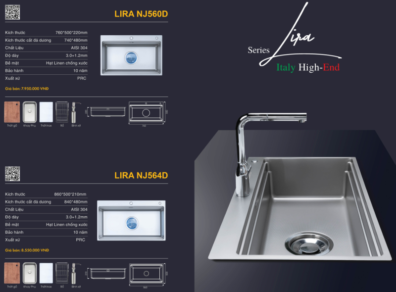 - Chậu rửa bát NoBiNox LIRA NJ564D là lựa chọn lý tưởng cho những ai tìm kiếm sự bền bỉ và sang trọng trong không gian bếp. Sản phẩm được làm từ inox 304 chuẩn AISI 18/10, mang lại khả năng chống oxy hóa và an toàn tuyệt đối cho sức khỏe gia đình. Đặc biệt, bề mặt hạt Linen giúp chống xước và bám bẩn hiệu quả, giữ chậu luôn mới dù sử dụng lâu dài.