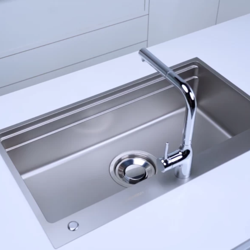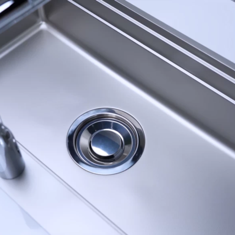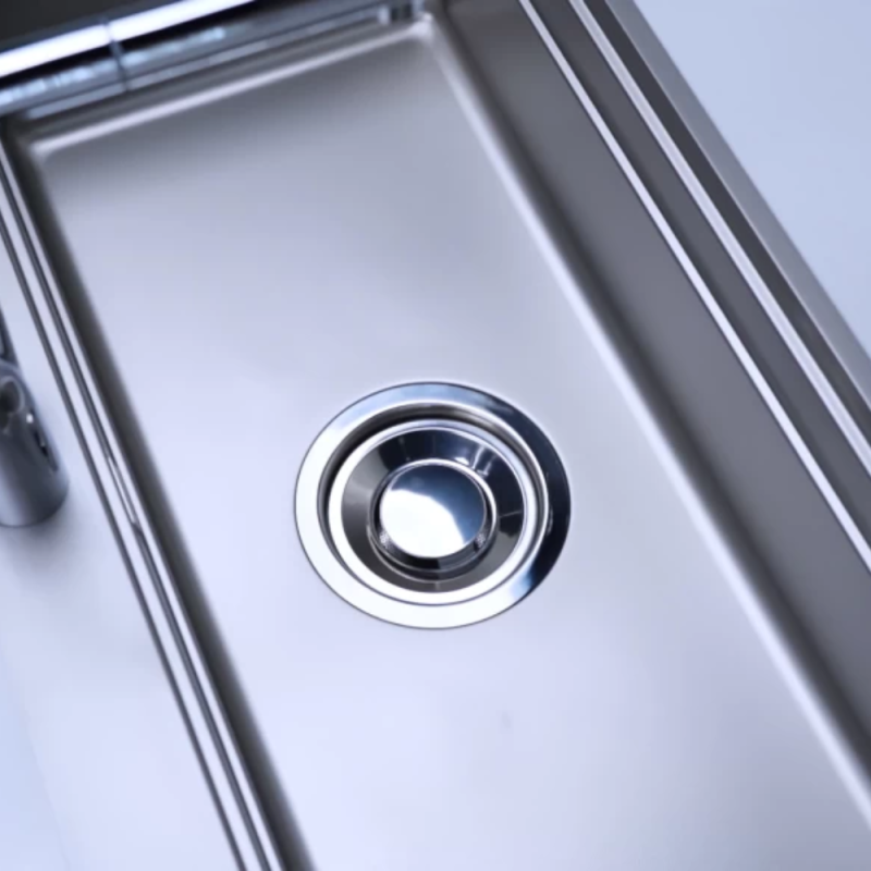 - Thiết kế chậu 1 hố với lòng sâu, góc bo tròn tinh tế giúp tăng dung tích chứa và thuận tiện vệ sinh, đồng thời hạn chế nước bắn ra ngoài. Bát rác kích thước lớn 185mm và hệ thống lọc 3 lớp giúp thoát nước nhanh, tránh tình trạng tắc nghẽn phổ biến, phù hợp với phong cách sử dụng của người Việt.