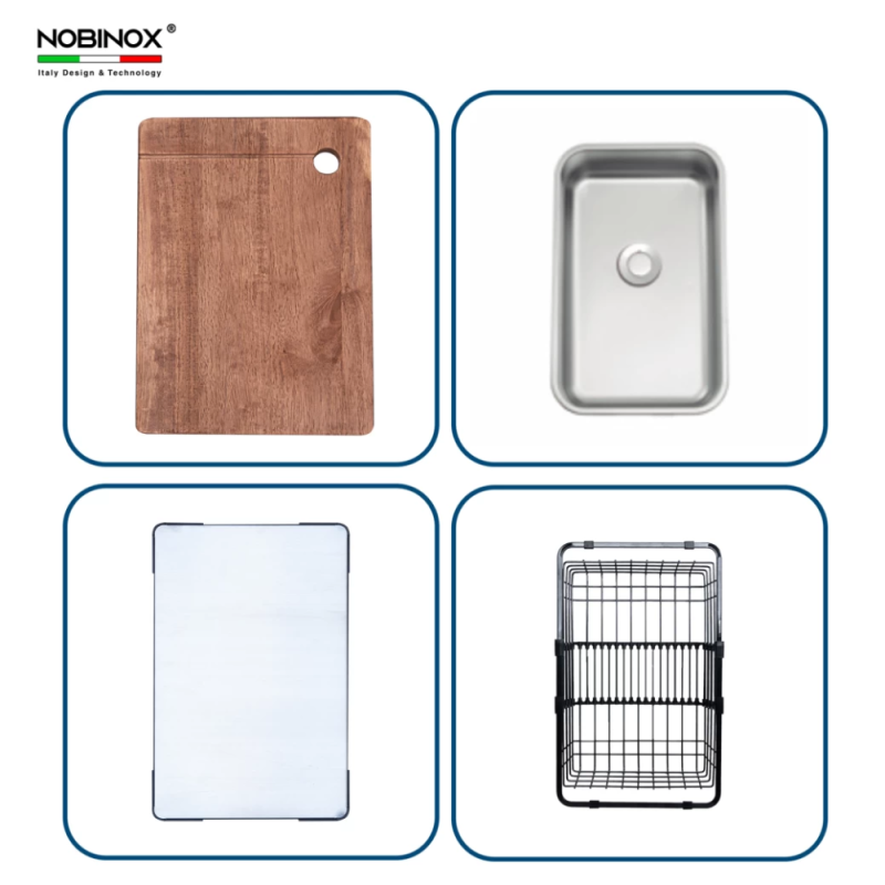- Phụ kiện đa dạng đi kèm: Thớt gỗ, thớt inox, khay LK và rổ JL hỗ trợ tối ưu công việc bếp núc.