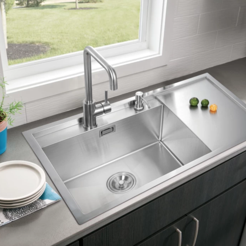 - Bề mặt inox xử lý vân xước hiện đại, tạo điểm nhấn sang trọng cho không gian bếp và rất dễ vệ sinh.
