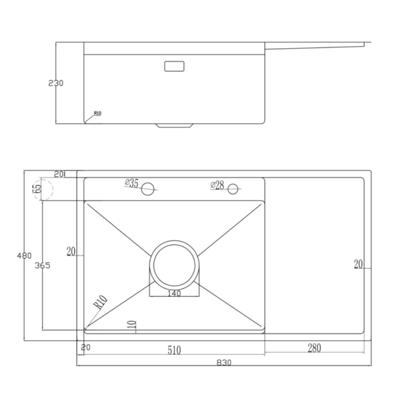 - Kích thước tổng thể: 830 × 480 × 230 mm
