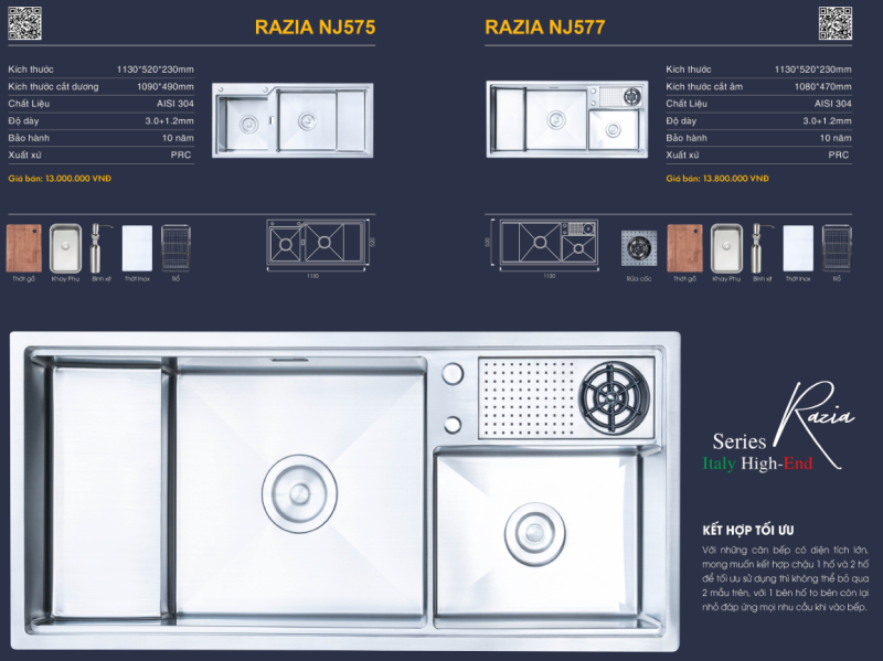 - NoBiNox RAZIA NJ575 không chỉ là một thiết bị rửa thông thường – mà là giải pháp bếp toàn diện, phù hợp với mọi gia đình yêu thích sự gọn gàng, hiện đại và tiện nghi. Bảo hành chính hãng 10 năm, xứng đáng để bạn yên tâm đầu tư lâu dài.
