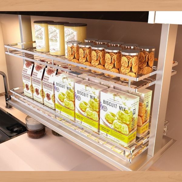 - Khoảng cách hạ tối đa khoảng 300 mm giúp người dùng dễ dàng tiếp cận gia vị ở cả hai tầng mà không cần với cao hay cúi thấp.