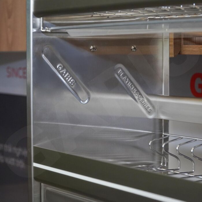 - Garis GL06.90AG để lại ấn tượng mạnh về tính tiện nghi ngay từ những lần đầu sử dụng. Khi kéo giá bát từ vị trí cao xuống, thao tác diễn ra nhẹ nhàng và trơn tru, giúp việc cất – lấy bát đĩa không còn là việc mất sức hay khó chịu như với giá cố định truyền thống.