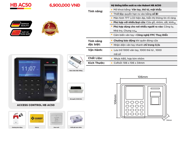 - Hệ thống HB AC50 mang thiết kế hiện đại, gọn gàng với kích thước 106 × 106 × 34 mm, thân vỏ làm từ nhựa ABS kết hợp hợp kim nhôm, mang lại độ bền cơ bản và vẻ ngoài chuyên nghiệp. Với mặt trước là màn hình TFT LCD hiển thị rõ ràng thông tin người dùng, trạng thái hoạt động và lịch sử truy cập, thiết bị dễ dàng tích hợp vào môi trường văn phòng, nhà trọ hoặc chung cư nhiều người sử dụng. Tổng thể phần “Thiết kế” cho thấy sản phẩm hướng đến tính chuyên nghiệp và tiện dụng.