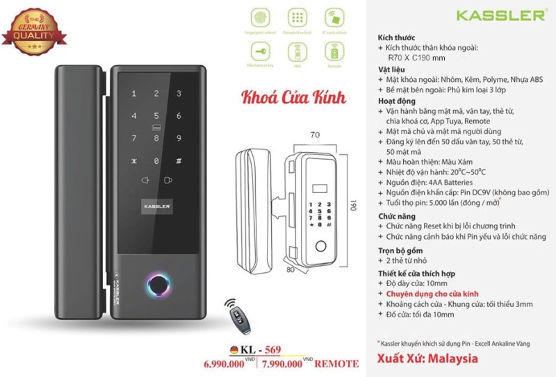 THÔNG SỐ KỸ THUẬT KHOÁ CỬA KÍNH KASSLER KL-569 APP-REMOTE