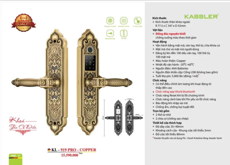 THÔNG SỐ KỸ THUẬT KHOÁ ĐẠI SẢNH KASSLER KL-919 PRO COPPER