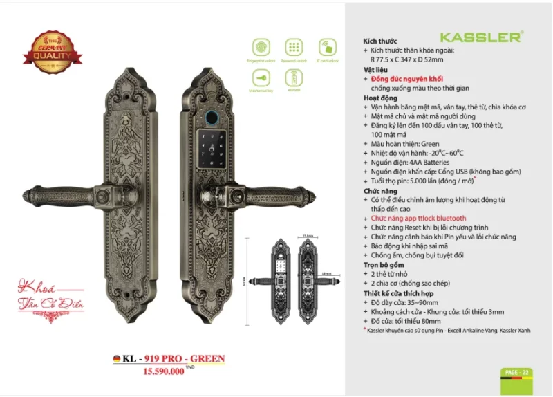 THÔNG SỐ KỸ THUẬT KHOÁ ĐẠI SẢNH KASSLER KL-919 PRO GREEN