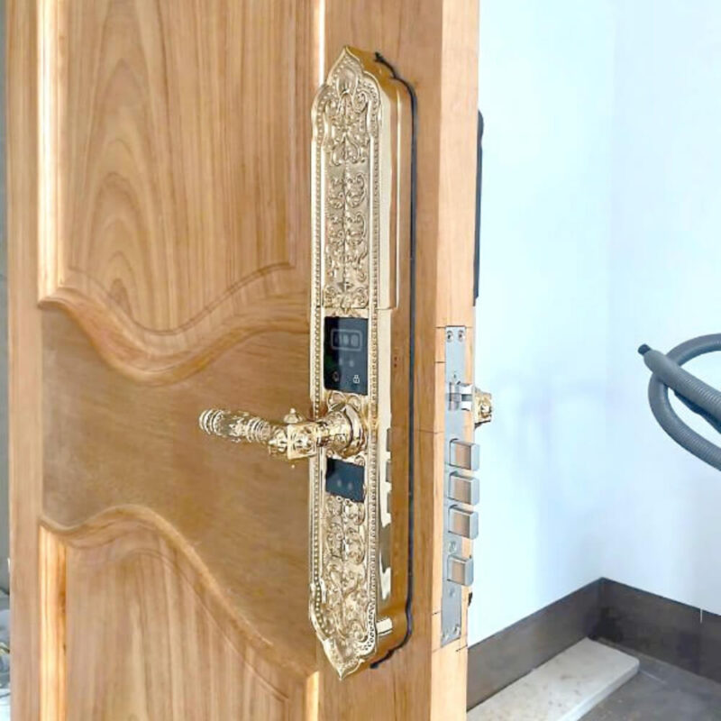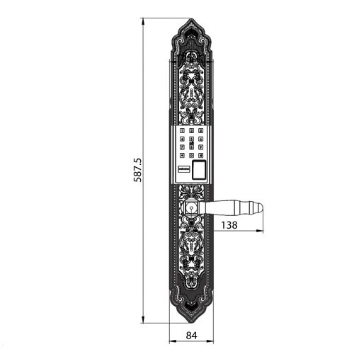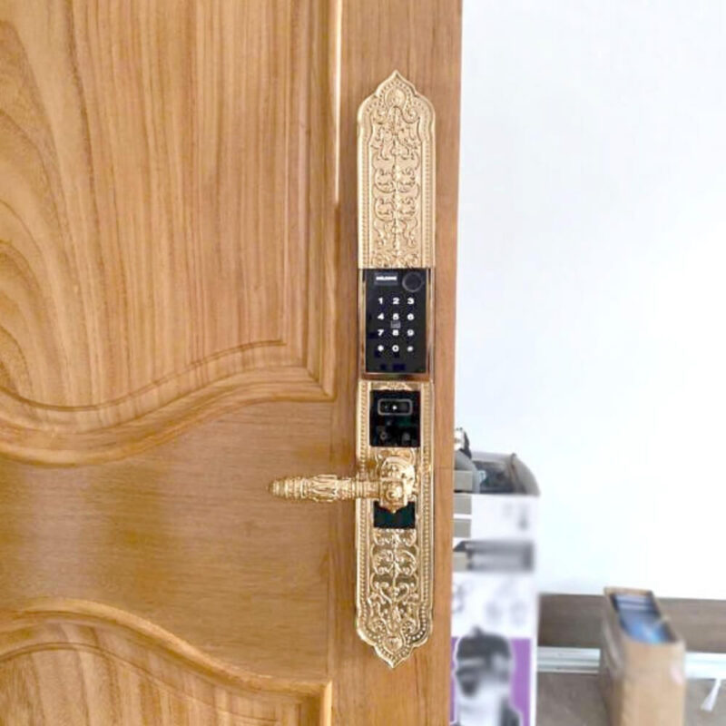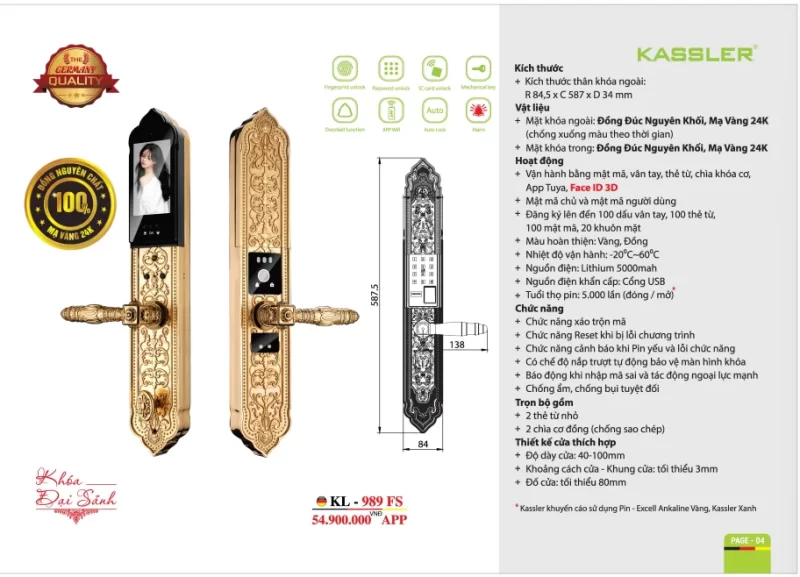 Khóa Kassler KL-989 FS được chế tác từ đồng đúc nguyên khối mạ vàng 24K, không chỉ mang đến độ bền vượt trội mà còn giữ được màu sắc sang trọng, không xuống màu theo thời gian. Với kích thước lớn (R 84,5 x C 587 x D 34 mm), khóa toát lên sự bề thế và quyền lực, rất phù hợp cho cửa đại sảnh, biệt thự hay khách sạn cao cấp. - Đa dạng phương thức mở khóa hiện đại