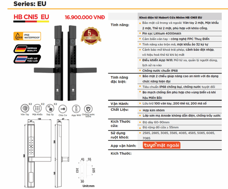 THÔNG SỐ KỸ THUẬT KHÓA ĐIỆN TỬ HUBERT HB CNI5 EU