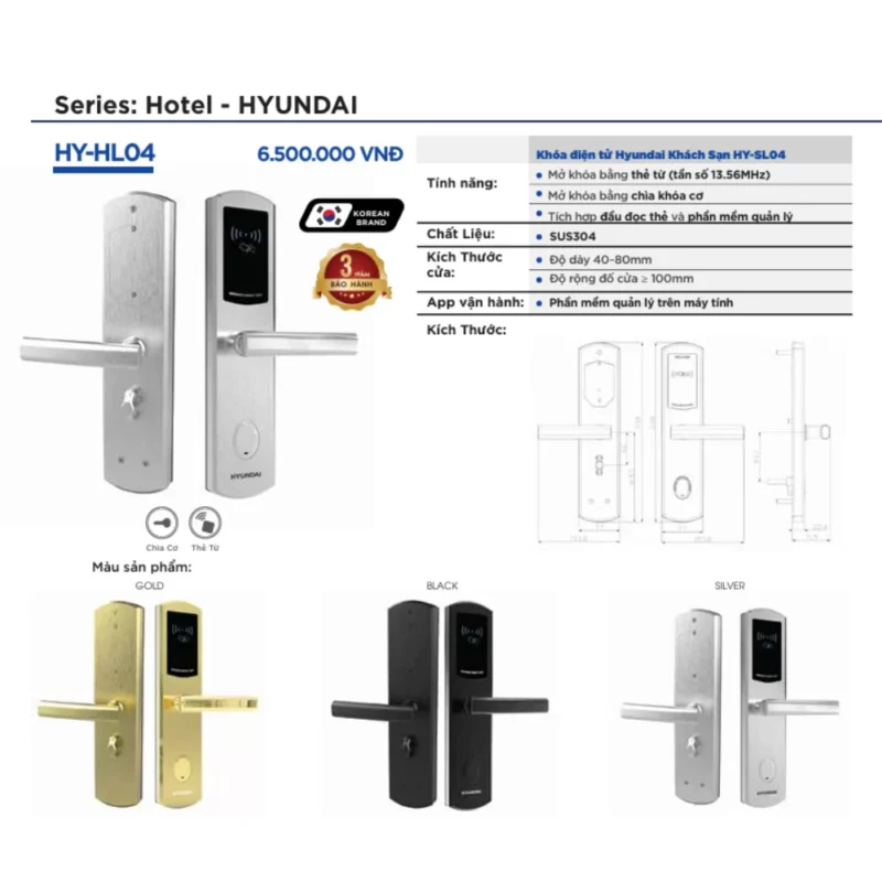 - Tổng kết lại, Hyundai HY-HL04 Black là giải pháp khóa điện tử tối ưu cho các khách sạn, resort hay homestay muốn nâng cao tính chuyên nghiệp và bảo mật. Sản phẩm kết hợp hài hòa giữa thiết kế tinh tế, hiệu suất ổn định và khả năng quản lý thông minh, mang lại sự an tâm cho cả chủ đầu tư lẫn khách hàng. Đây là lựa chọn đáng cân nhắc cho những đơn vị muốn chuẩn hóa hệ thống quản lý lưu trú theo hướng hiện đại.