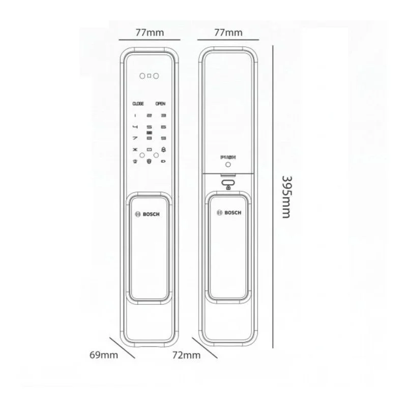 - Thiết kế cao cấp với vật liệu bền bỉ: Khóa sử dụng hợp kim nhôm và màn hình kính cường lực IML cho mặt ngoài, mang lại vẻ hiện đại và khả năng chống va đập cao. Mặt trong cũng làm từ hợp kim nhôm giúp tăng độ bền và sự đồng bộ trong thiết kế. Kích thước lớn (395 × 77 × 72 mm) tạo cảm giác chắc chắn, phù hợp với cửa gỗ hoặc cửa thép. Tổng thể mang lại một sản phẩm có độ hoàn thiện cao, sang trọng và phù hợp với nhiều không gian nội thất.