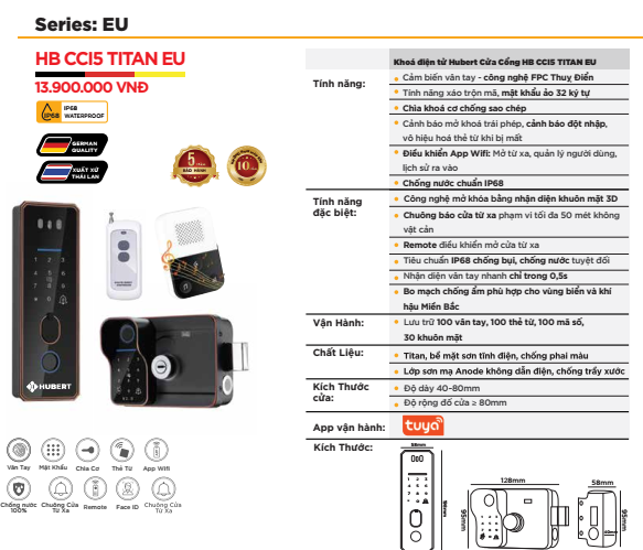 THÔNG SỐ KỸ THUẬT KHÓA VÂN TAY CỬA CỔNG HUBERT HB CCI5 TITAN EU