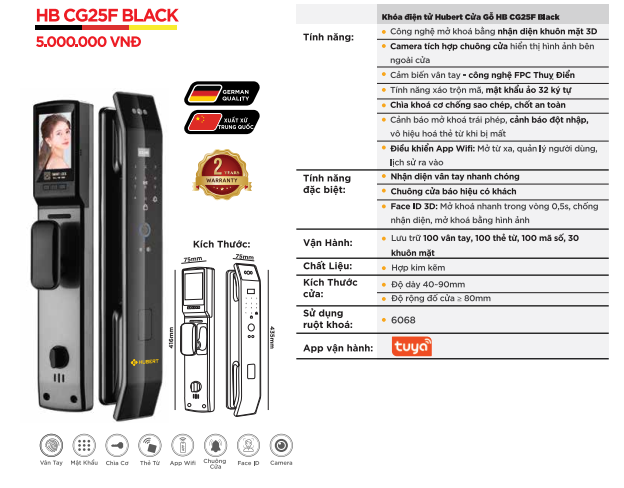 THÔNG SỐ KỸ THUẬT KHÓA VÂN TAY CỬA GỖ HUBERT HB CG25F BLACK