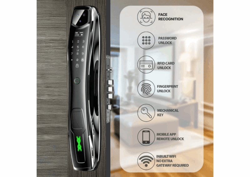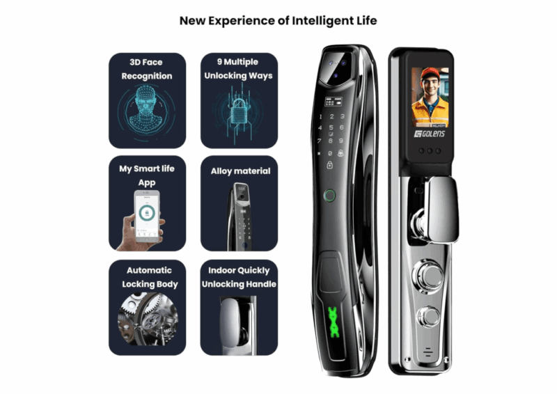 • Tính năng: vân tay, mật mã, thẻ từ, chìa cơ, FaceID và App TUYA