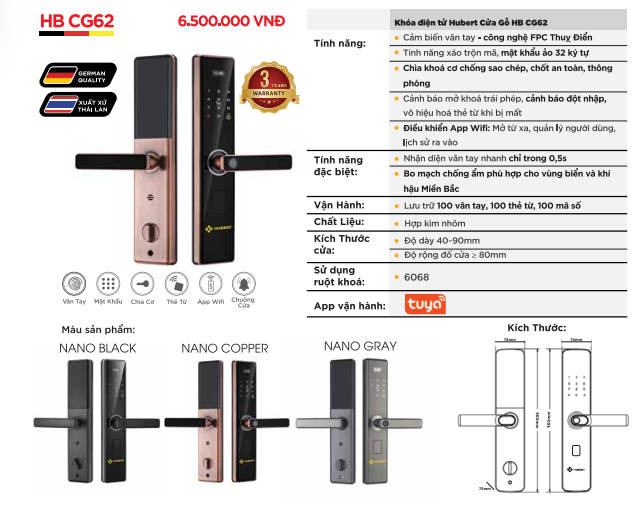 THÔNG SỐ KỸ THUẬT KHÓA VÂN TAY CỬA GỖ HUBERT HB CG62 NANO COPPER
