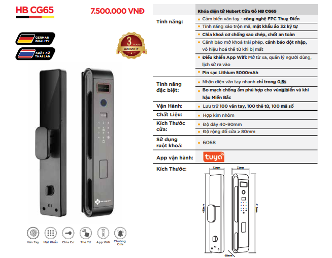 THÔNG SỐ KỸ THUẬT KHÓA VÂN TAY CỬA GỖ HUBERT HB CG65