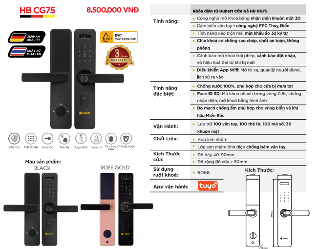 THÔNG SỐ KỸ THUẬT KHÓA VÂN TAY CỬA GỖ HUBERT HB CG75 ROSE GOLD