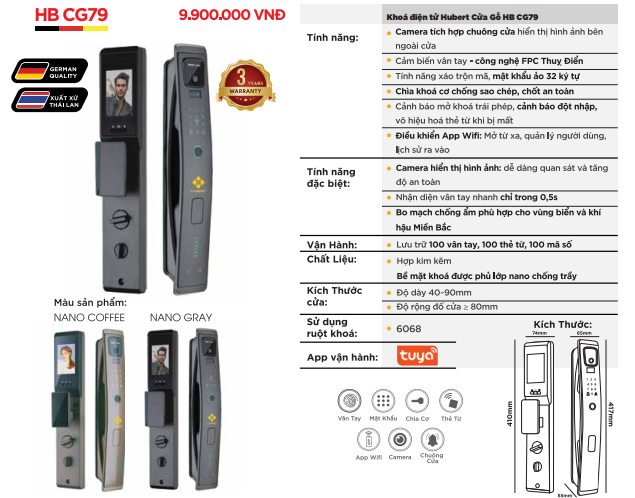 THÔNG SỐ KỸ THUẬT KHÓA VÂN TAY CỬA GỖ HUBERT HB CG79 NANO COFFEE