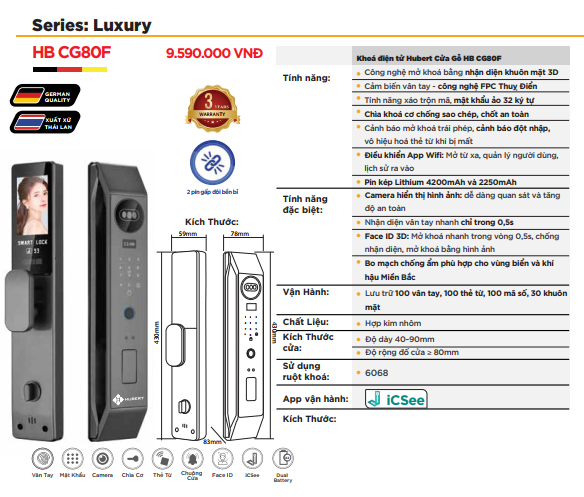 - Tổng thể, Hubert HB CG80F là một mẫu khóa vân tay cửa gỗ cao cấp, dung hòa giữa thiết kế sang trọng, hiệu suất vận hành nhanh nhạy và hệ thống bảo mật thông minh. Đây là lựa chọn phù hợp cho những gia đình mong muốn một giải pháp khóa thông minh toàn diện, vừa tiện lợi, vừa an toàn, đồng thời bền bỉ trong điều kiện khí hậu Việt Nam.