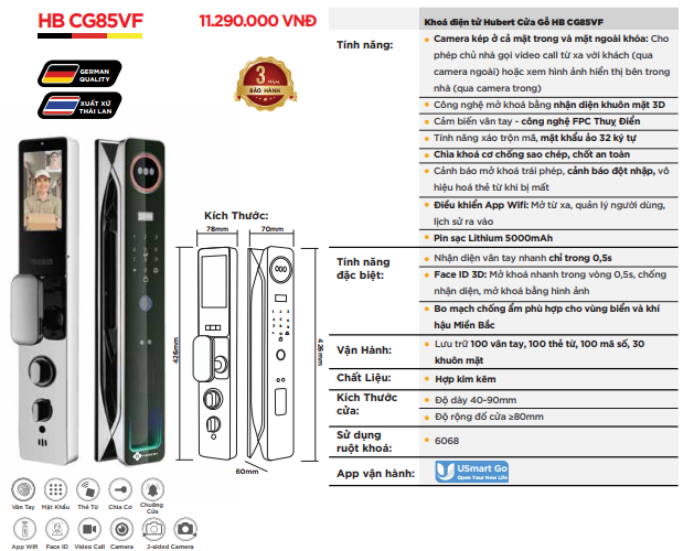KHÓA VÂN TAY CỬA GỖ HUBERT HB CG85VF được phân phối chính hãng bới Thiết Bị Ngoại Nhập, giao hàng nhanh, bảo hành và bảo trì tại nhà nhanh chóng.