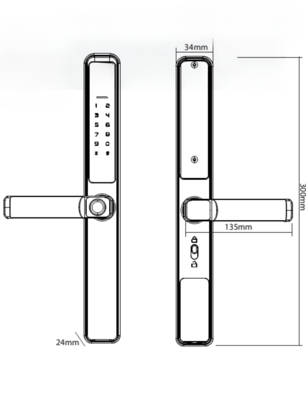 Thân khóa được chế tạo từ hợp kim kẽm cứng cáp, kết hợp lớp sơn nhám tĩnh điện giúp chống bám vân tay và chống trầy xước hiệu quả. Hoàn thiện bề mặt màu đen tạo dáng sang trọng, đồng thời giữ sạch lâu và dễ lau chùi. Vật liệu này cân bằng giữa độ bền cơ học và thẩm mỹ, phù hợp với cửa nhôm hiện đại. Kết cấu chắc chắn góp phần bảo vệ lõi và linh kiện bên trong khỏi va đập nhẹ. - Tương thích cửa nhôm & thông số kỹ thuật lắp đặt
