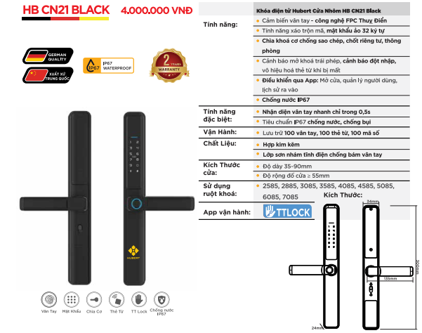 THÔNG SỐ KỸ THUẬT KHÓA VÂN TAY CỬA NHÔM HUBERT HB CN21 BLACK