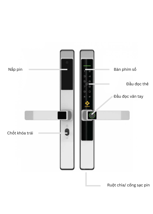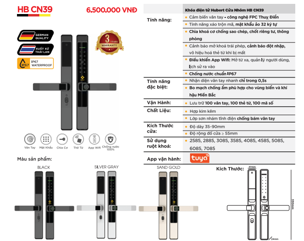 • Tính năng: vân tay, mật mã, thẻ từ, chìa cơ và App TUYA