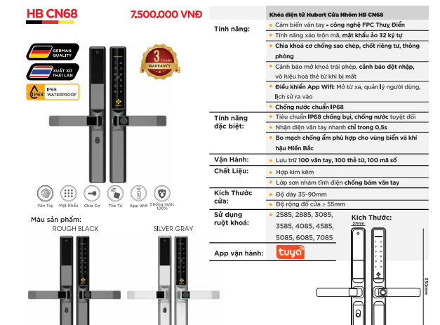 THÔNG SỐ KỸ THUẬT KHÓA VÂN TAY CỬA NHÔM HUBERT HB CN68 ROUGH BLACK