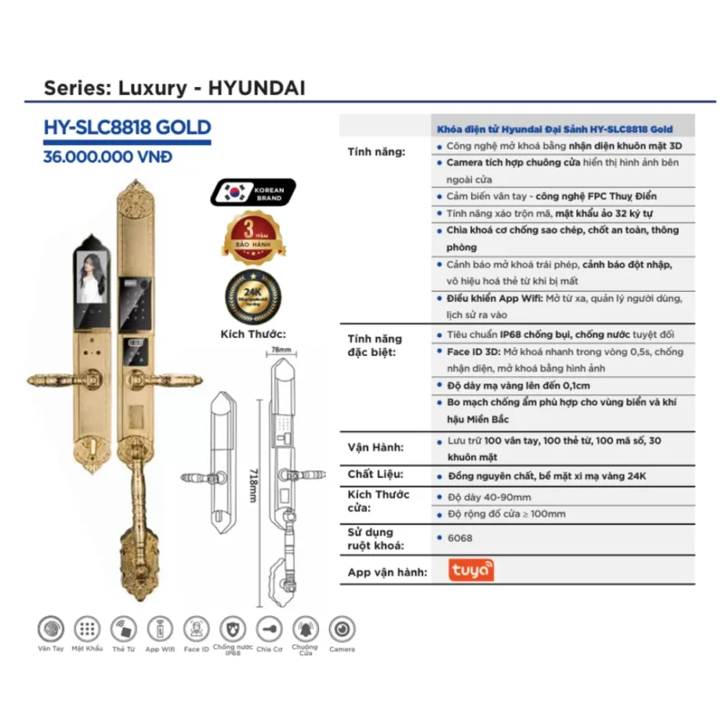 • Tính năng: mật mã, vân tay, thẻ từ, chìa khóa cơ, FaceID và APP TUYA