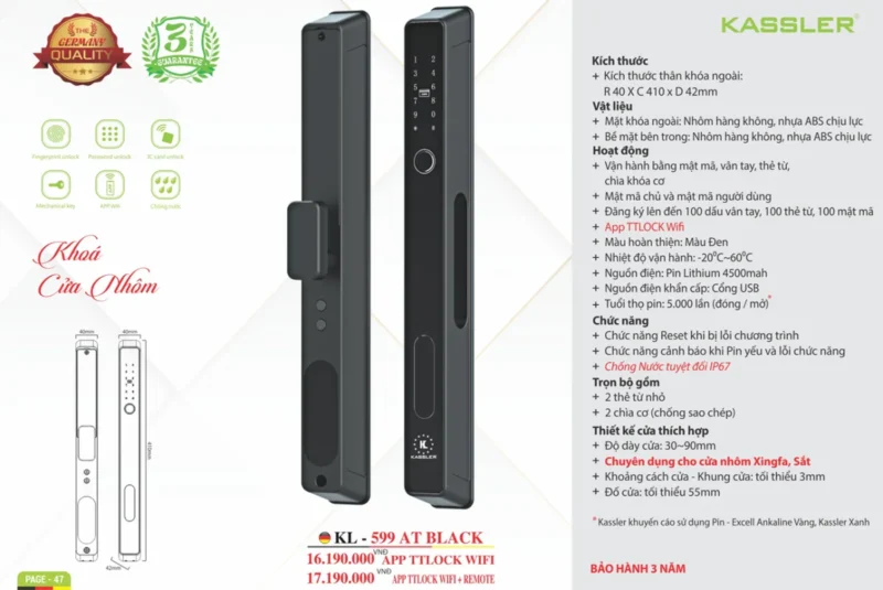 THÔNG SỐ KỸ THUẬT KHOÁ VÂN TAY KASSLER KL-599 AT BLACK APP-REMOTE