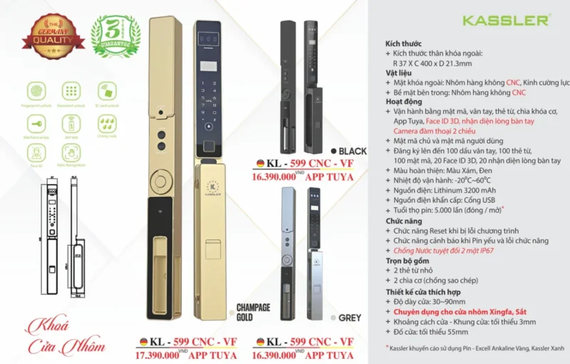 - Khóa vân tay Kassler KL-599 CNC-VF Grey là một trong những sản phẩm khóa thông minh cao cấp nhất hiện nay, được thiết kế dành cho cửa nhôm Xingfa và cửa sắt, đáp ứng nhu cầu bảo mật tuyệt đối – công nghệ tiên tiến – thẩm mỹ sang trọng. Đây là lựa chọn hoàn hảo cho những không gian hiện đại, từ căn hộ cao cấp đến văn phòng và biệt thự.