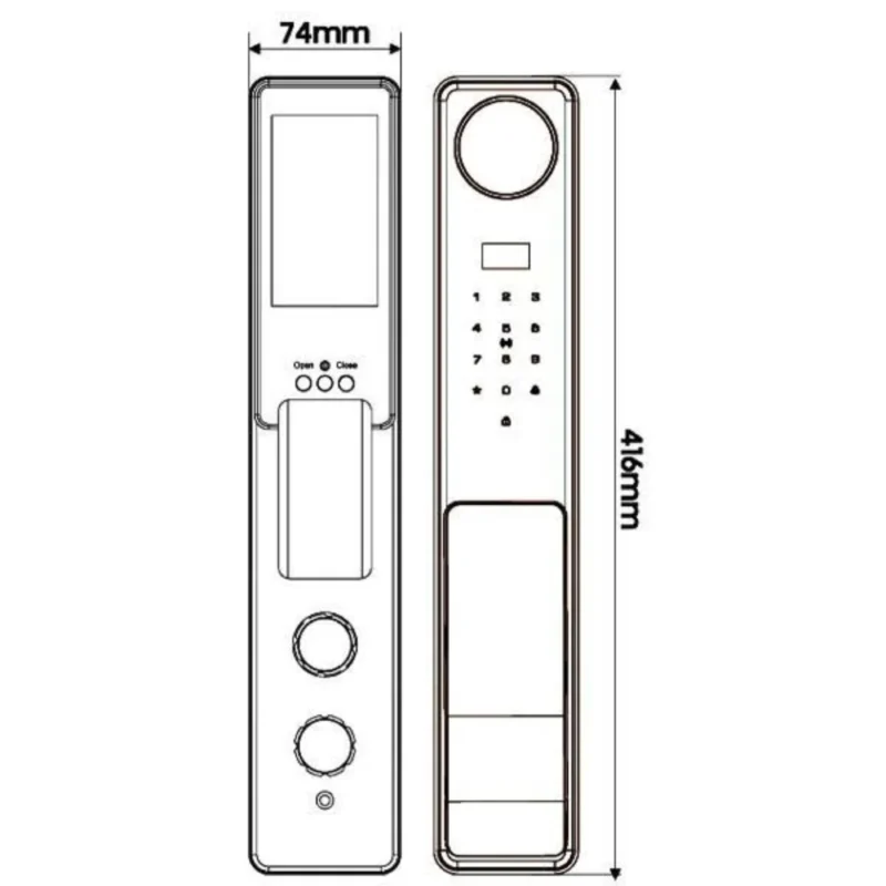 - Kích thước thân khóa ngoài: R74 x C416 x D54 mm