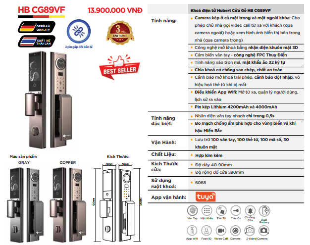 THÔNG SỐ KỸ THUẬT KHÓA VÂN TAY CỬA GỖ HUBERT HB CG89VF COPPER