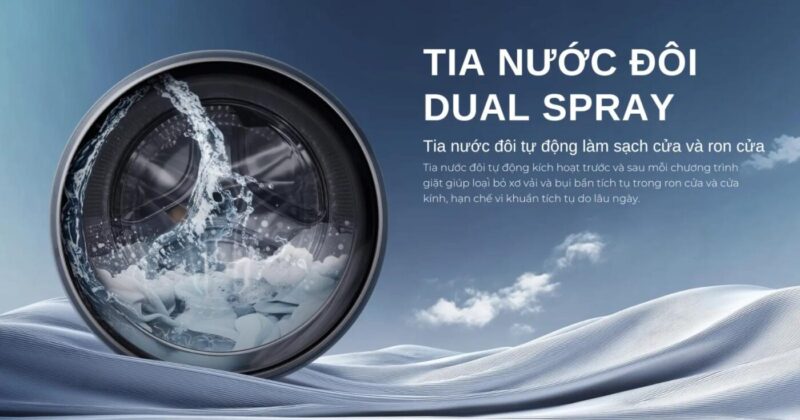 Hệ thống Smart Dual Spray tự động phun nước làm sạch mặt trong cửa và vòng đệm sau mỗi lần giặt. Vòng đệm kháng khuẩn ABT giúp hạn chế vi khuẩn và nấm mốc tích tụ. Nhờ đó, khoang giặt luôn sạch sẽ, đảm bảo vệ sinh và độ bền cho máy.