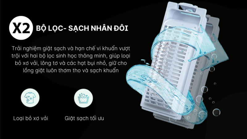 Máy được trang bị bộ lọc sinh học thông minh loại bỏ xơ vải và lông tơ, mâm giặt kháng khuẩn ABT ngăn vi khuẩn phát triển, cùng các tiện ích như khóa trẻ em, hẹn giờ giặt và tự khởi động lại khi có điện, mang đến sự tiện lợi và an tâm khi sử dụng.